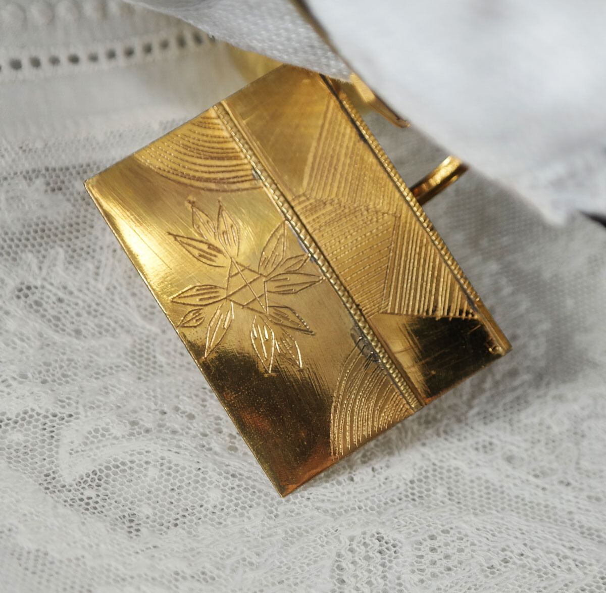 Antiek koperen oorijzer met goud vergulden boeken. Boeken aan een zijde prachtig gegraveerd! Gedragen in de streekdracht van Zuid-Beveland. Wij zien veel overgebleven gouden en zilveren oorijzers maar bedenkt dat vroeger het grootste gedeelte van de bevolking daar geen geld voor had en het met verzilverd, koper of koper verguld moest doen. Daarom heel interessant. Het oorijzer is geheel met de hand gemaakt en op alle onderdelen gekeurd met de initialen van de maker JT. Daarbij 2 passende goud vergulden bolspelden van 31,5mm. Het geheel is compleet met de originele Katholieke kanten muts met geborduurde tule, witte ondermuts en blauw tussenmutsje. Ca. 1910-1920. Laatste foto voorbeeld Zuid-Bevelandse dracht.