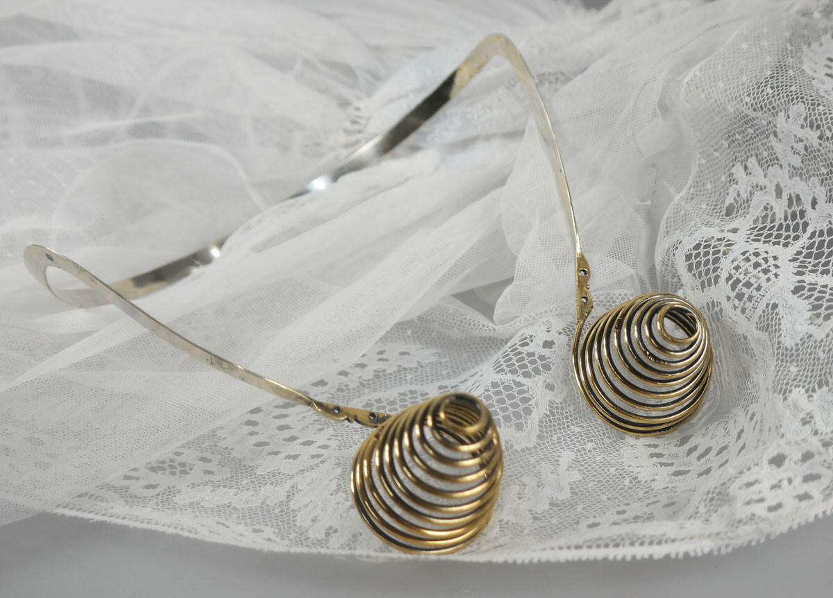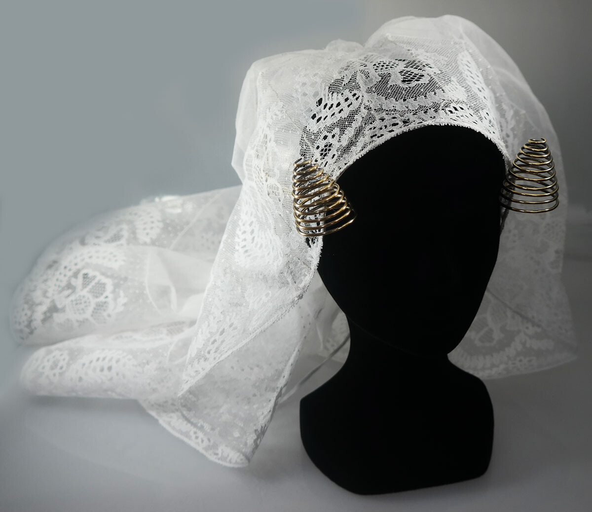 Antiek zilveren oorijzer met zilver vergulden krullen van de streekdracht Zuid-Hollandse eilanden. Het oorijzer zelf is gekeurd met de jaarletter Q uit 1875. De krullen zijn gekeurd met Nederlands gehalteteken de leeuw en kantoorstempel D van Rotterdam. Jaarletter W uit 1871. Geleverd incl. een antieke Zuid-Hollandse keuvelmuts met een 14cm brede strook kant. Een ingenaaid karkas, frame (een hulpmiddel om de keuvel een vaste stand te geven). Laatste foto uit 1910 met zondagse japon. Uit het boek "De keuvels van het Overmase van P.W.de Zeeuw. Totaalgewicht oorijzer 71,20 gram.