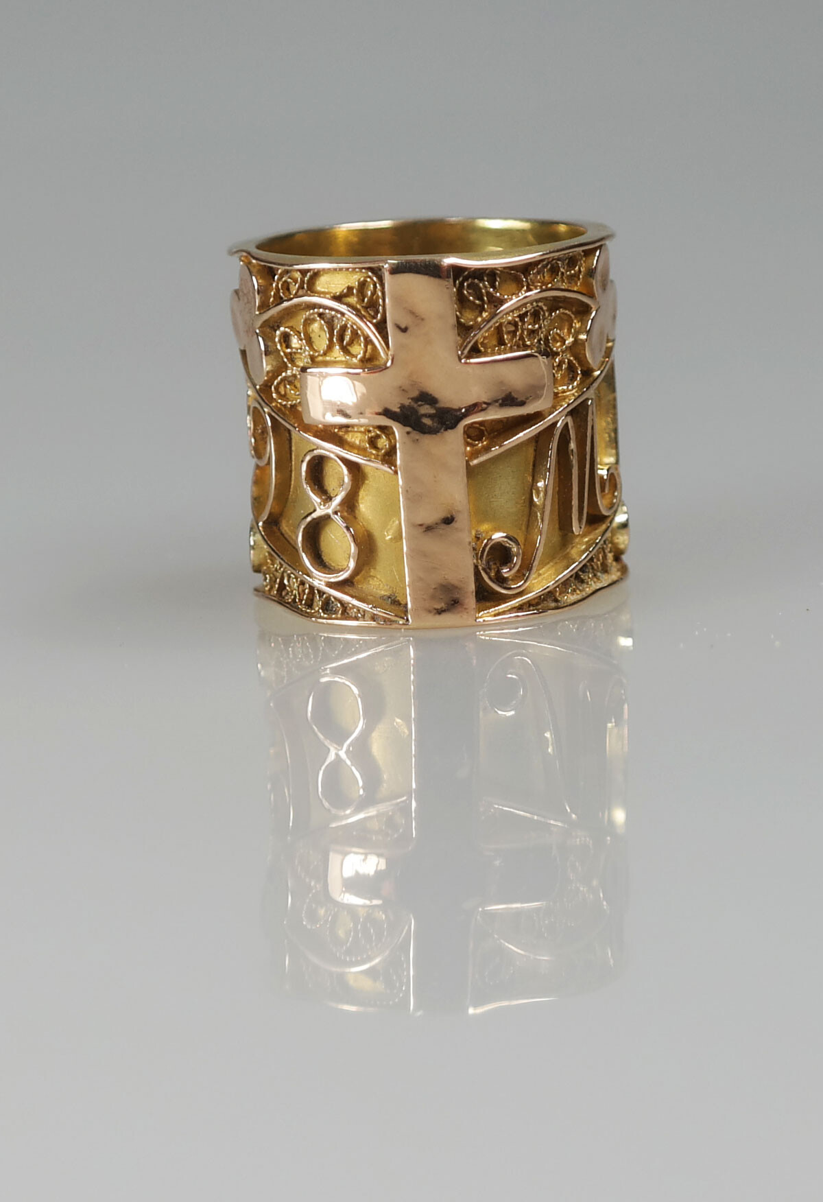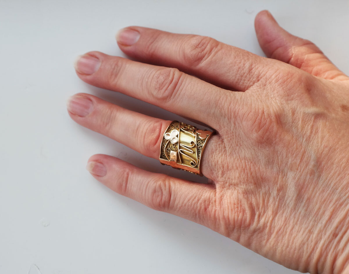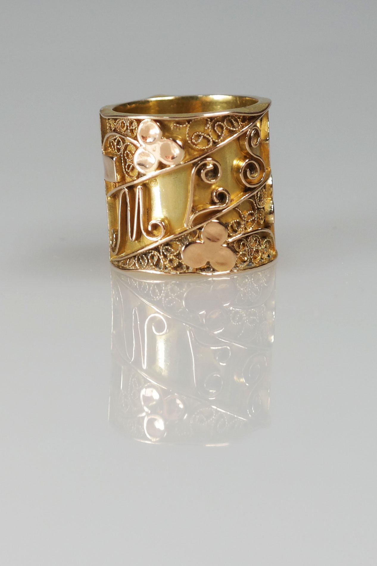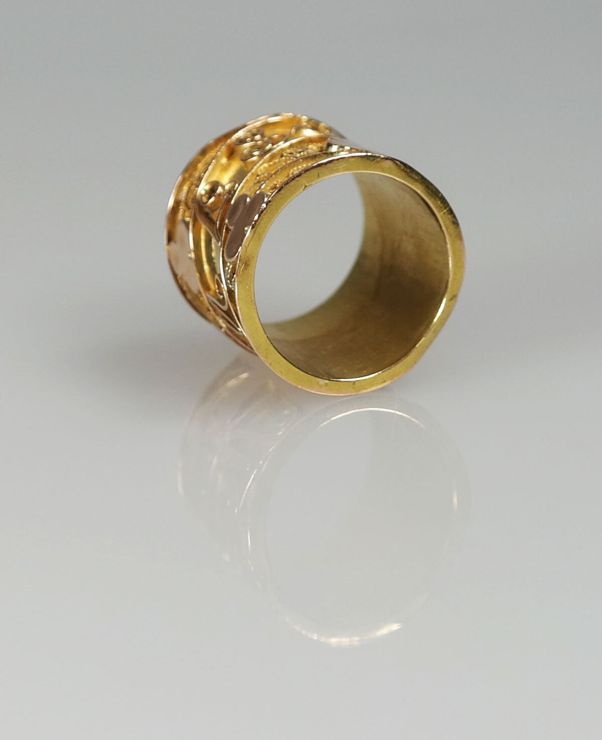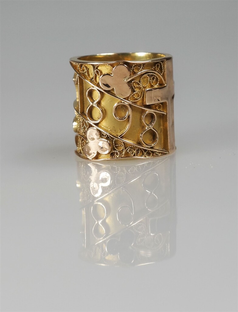 Zeldzame antieke 14-karaats gouden trouwring. Deze afwijkende variant trouwringen werden van af 1850 op Zuid-Beveland bij de rooms-katholieke vrouwen gedragen. Opgesoldeerd filigreinwerk versierd met kleine klaverblaadjes. Ook was er een kruis in verwerkt en werden de initialen en trouwjaar met draadwerk op de ring gesoldeerd. Deze ringen zijn vrij zeldzaam dit komt omdat er vermoedelijk weinig van in omloop zijn geweest. Vermoedelijk kon niet iedereen in dit relatief kleine katholieke gebied het zich veroorloven deze ring te laten vervaardigen. Zie ook het boek van Piet Minderhoud "De historie en ontwikkeling van Zeeuwse en andere streeksieraden". Initialen M.L.S. Trouwjaar 1898. Ring is 20mm.breed en heeft ringmaat 17,5. Gewicht 9,12 gram.