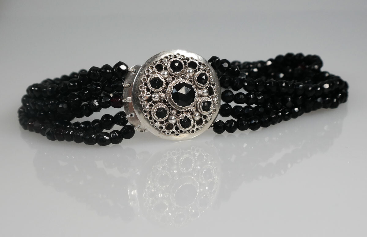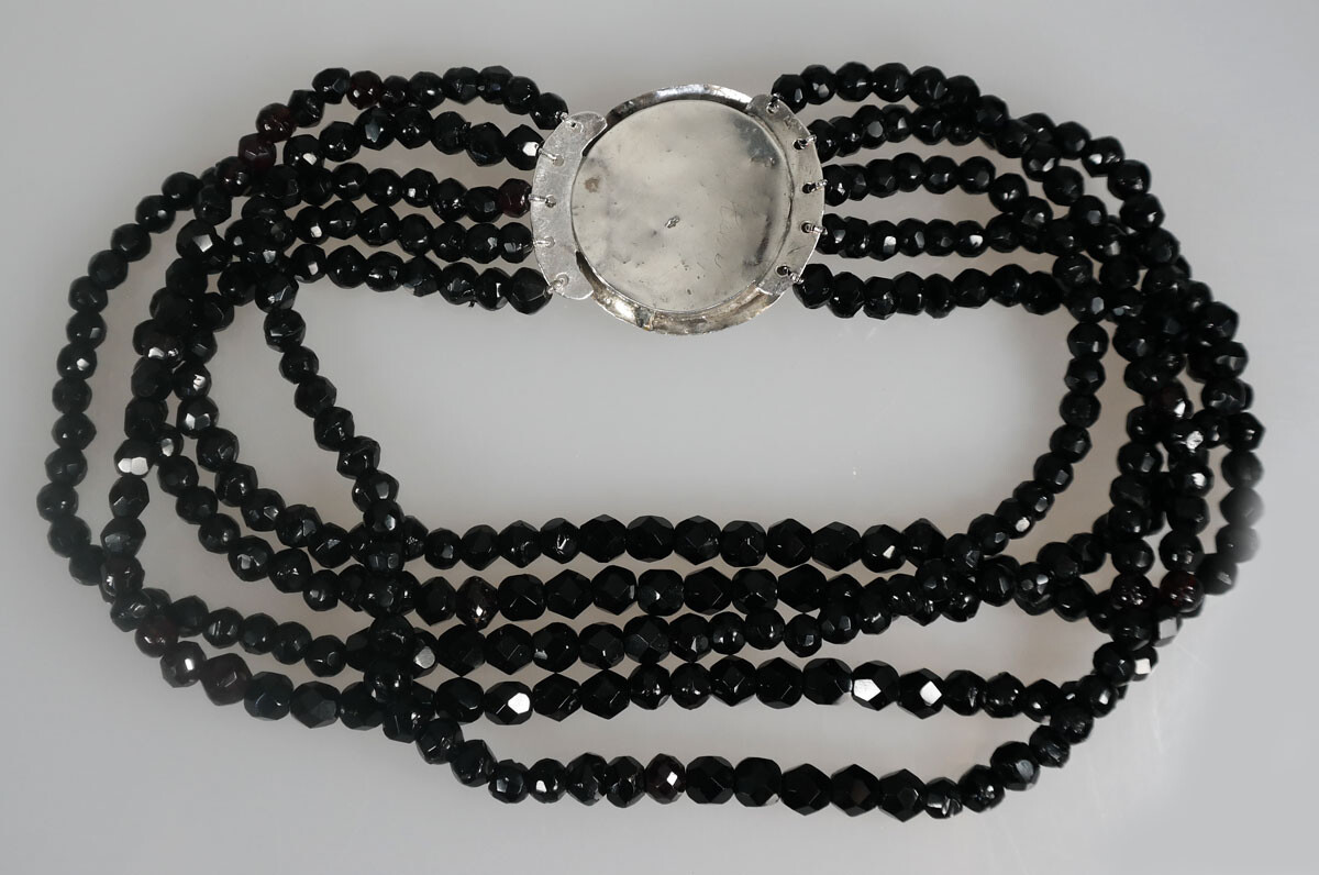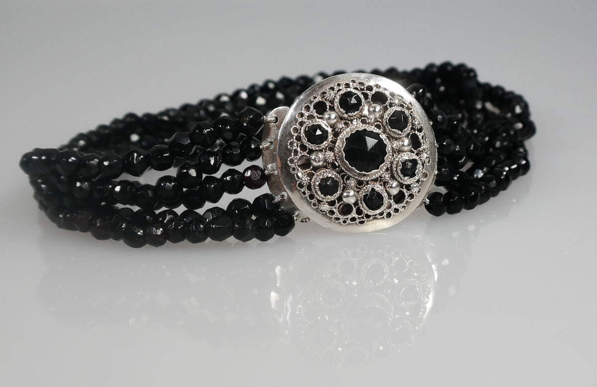 Antiek halssnoer, bestaande uit vijf strengen zwarte glasgitten aan een zilveren slot met stenen van glasgit. Het slot is gekeurd met Nederlands gehalteteken het zwaardje. Dit is gebruikt tussen 1814 en 1905. Ook gekeurd met tweemaal het meesterteken maar nog niet kunnen determineren. Deze zilveren sieraden met glasgit werden specifiek gedragen bij de rouw in de omgeving van Kampereiland en de Veluwe. Het antieke zilveren slot meet in diameter 38,8mm. De glasgitten zijn ca. 6-6,5mm. Totaalgewicht is 114,5 gram. Lengte kortste snoer 39cm. Lengte langste snoer 45 cm. Geheel opnieuw schoongemaakt en aflopend geregen zodat hij mooi om de hals valt! Deze rouw sieraden werden in de vorige eeuw niet echt gewaardeerd en ook veel omgesmolten. Ze zijn echter heel belangrijk voor de streekdracht van ons cultureel erfgoed!